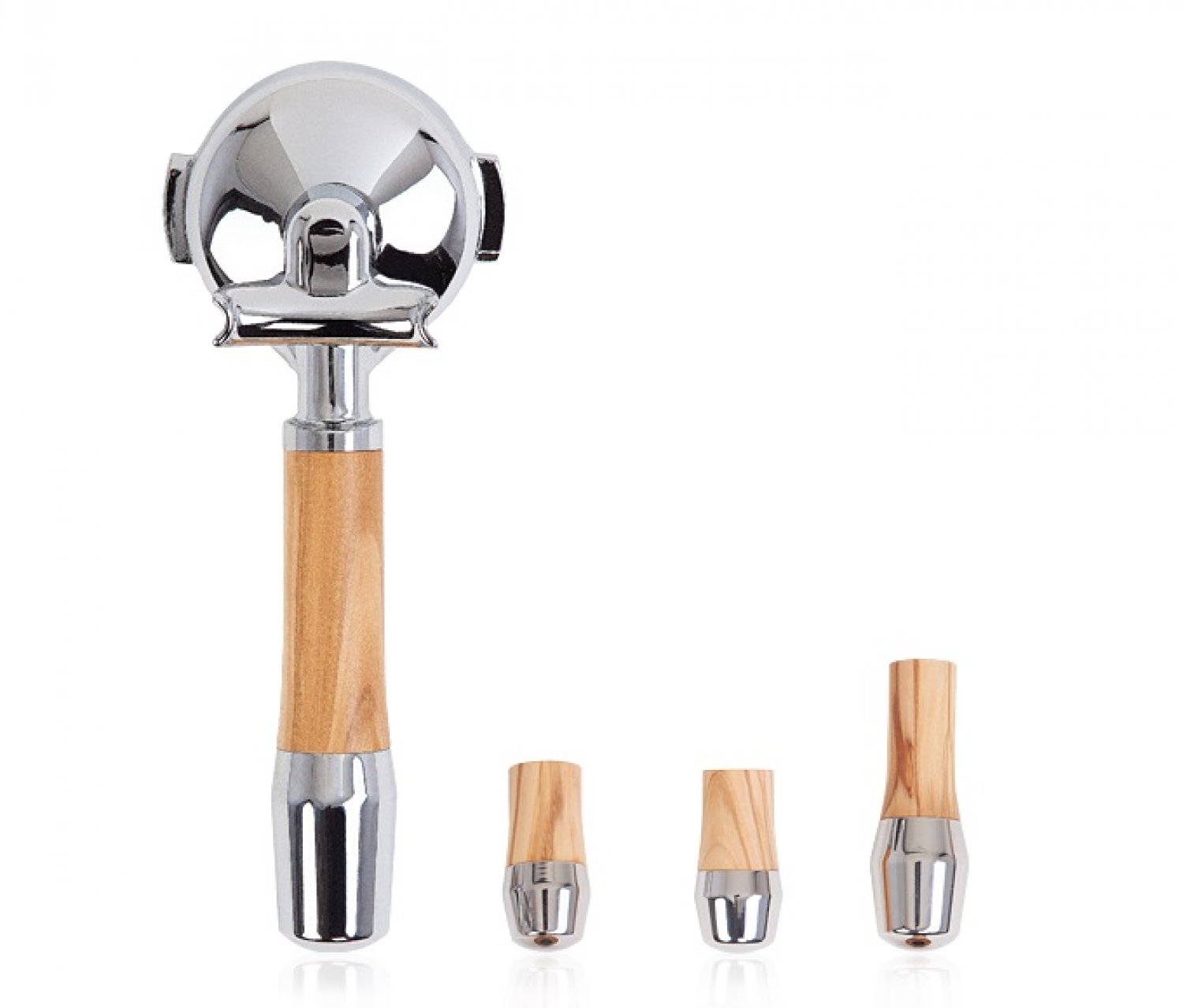 Material: Olivenholz, der Siebträgerkorpus ist aus verchromten Messing