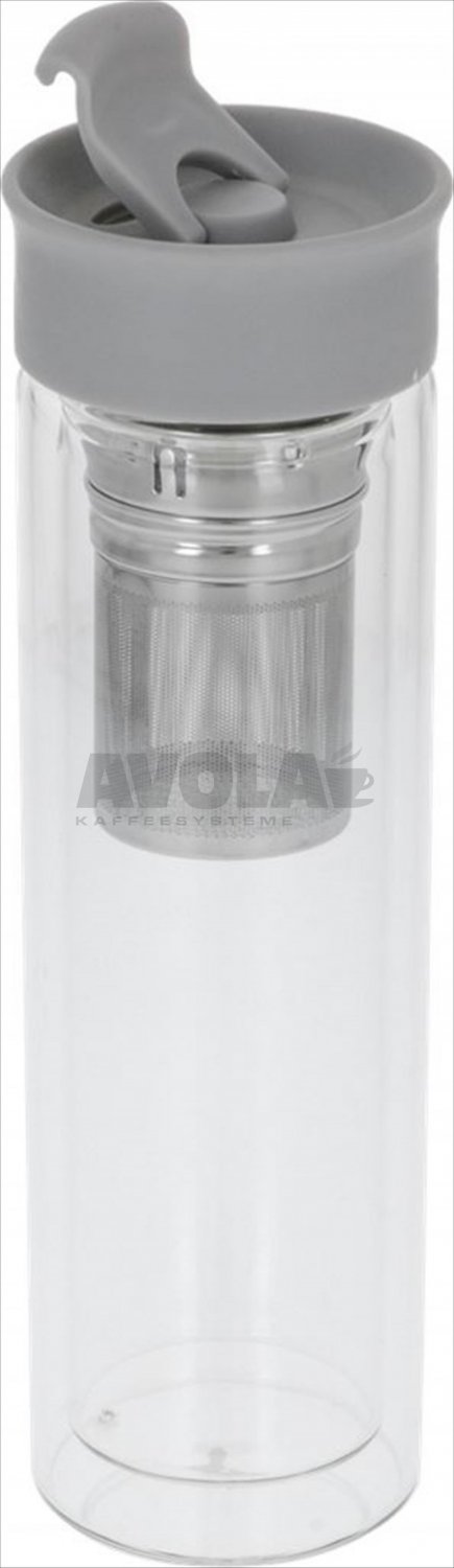 Flasche mit Infusor, doppelte Glaswand,|doppelter Edelstahlfilter, Kunststoffkappe|BPA-frei.|Komplett mit praktischem Etui.|Der Doppelfilter ermöglicht verschiedene|Einsatzmöglichkeiten: mit dem kurzen Filter|können Sie Aufgüsse mit Obst oder Gemüse machen,|der lange Filter ist perfekt für Aufgüsse mit|Kaffeebohnen oder Teeblättern.|Gehäuse ø 66 mm - Gesamthöhe 235 mm