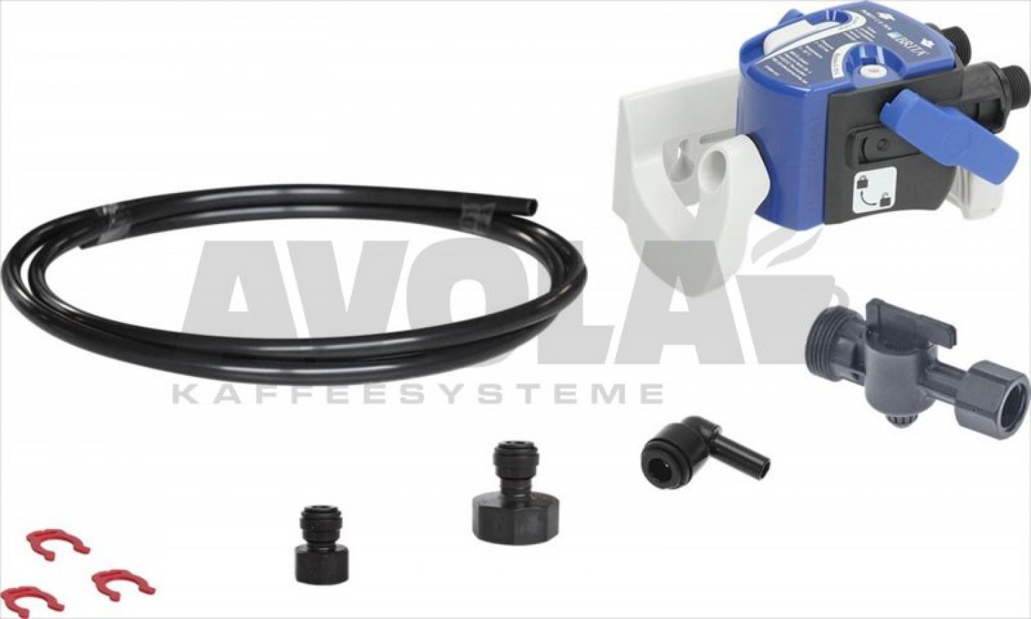 FILTERKOPF BRITA G3/8”|PE-Schlauch ø 6 x 8 mm 1,5 mt|ANSCHLUSS F3/4 “BSP flaches Ende Rohr ø 8 mm|WINKELANSCHLUSS Ansatz 8 mm - Schlauch ø 8 mm|GERADER ANSCHLUSS F3/8”BSP - Schlauch ø 8 mm|SPERRUNGSCLIP 5/16”|Absperrhahn 3/8”