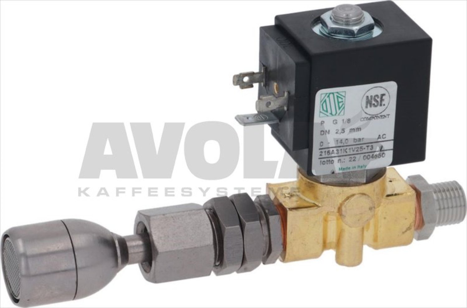 FKM seal - orifice 2.5 mm|with coil BDV08230AY 230/240V 50/60Hz 16VA|temperature -40°C+180°C|complete with fittings ø 1/4 GAS, ø 3/8 GAS|and brass water hose ø 3/8 GAS