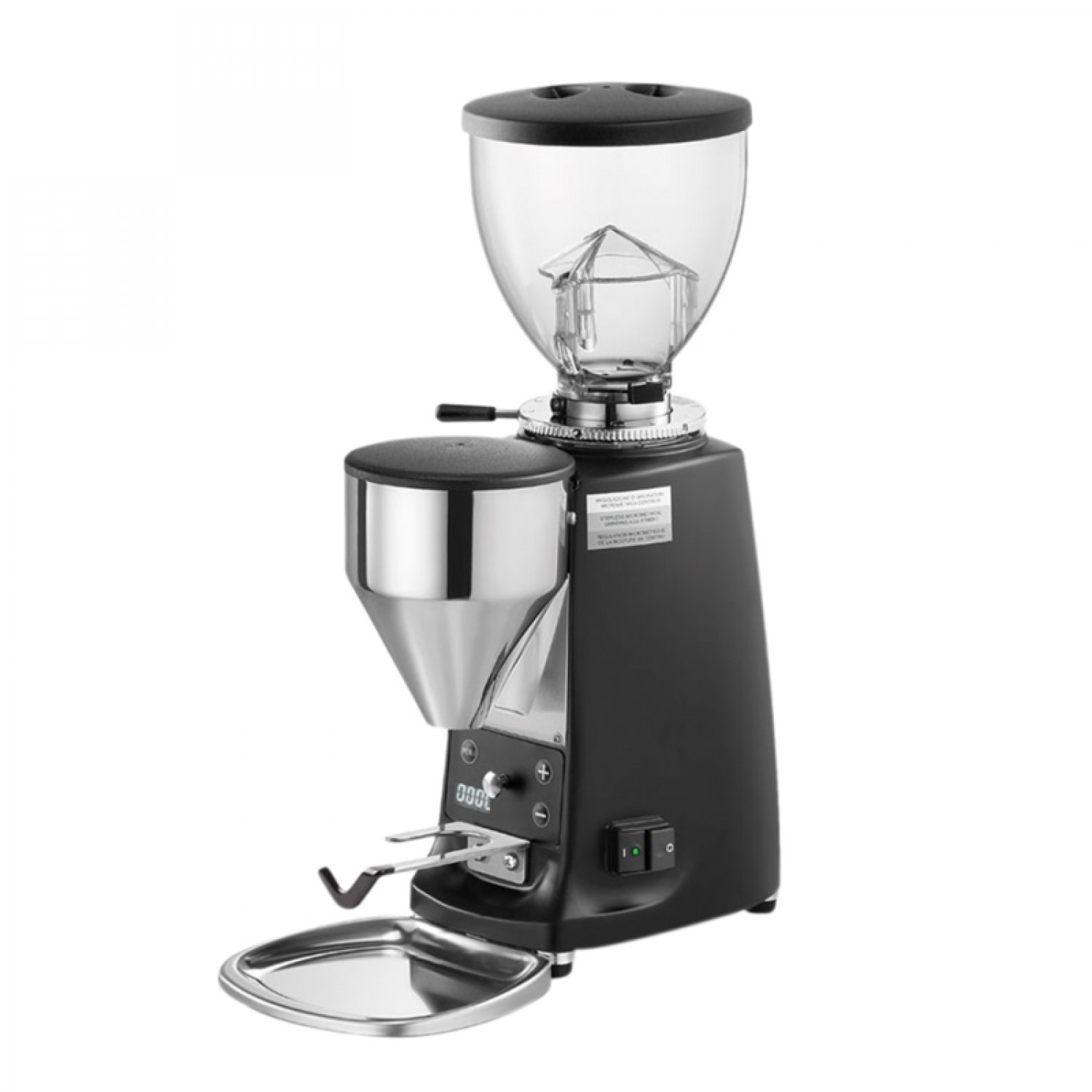Klassisch designte hochwertig verarbeitete Espressomühle mit wärmeisoliertem 64 mm Edelstahl- Scheibenmahlwerk, stufenloser mircometrischer Regulierung des Mahlgrades, Display mit Portionszähler, elektronischer Tipptasten-Steuerung für 2 Dosierungen und manueller Bedienung über Drucktaste, zielgenauer Portionierung über Edelstahltrichter, Einhandnutzung mit Siebträgerauflage und Gehäuse aus Schwarz Matt lackiertem Alu-Guss. W Motorleistung * 1400 U/min (50Hz)