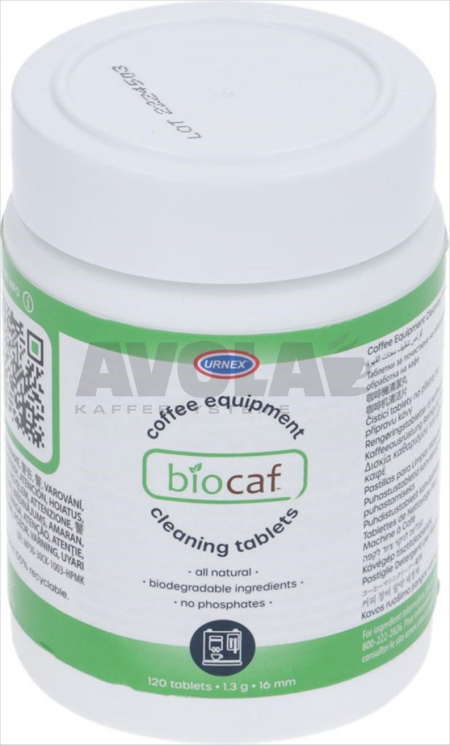 Detergent for COFFEE MACHINES - SUPER-AUTOMATIC|suitable for cleaning filter holders, |brewing groups and|hydraulic circuits|can with 120 1.3 g tablets ø 16 mm|Made with biodegradable ingredients derived|from natural sources, phosphate-free.|Odourless.|For use instructions enclosed documentation|NSF-CERTIFIED