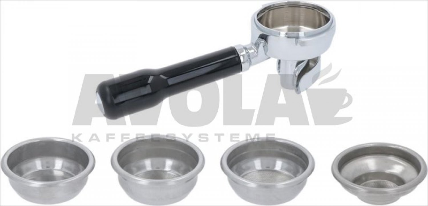Düsenanschluss ø 3/8 - Griffanschluss M12|Flügel 6,3 mm - mit Feder.|Standard-Siebträger|2-Wege-Auslauf Coffee Slide|Klassischer schwarzer Schräggriff|4 Filter aus Edelstahl:|1x Filter 1 Tasse (9-11 gr)|1x Filter 2 Tassen (14-18 gr)|1x Filter 2 Tassen (18-21 gr)|1x Blindfilter